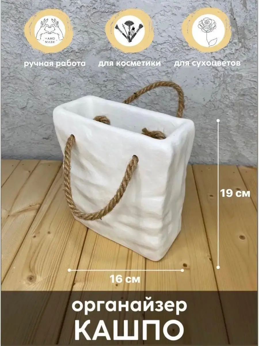 Органайзер Сумочка с вязанными ручками - это тренд, который еще долго будет оставаться актуальным. Его можно использовать для различных предметов или канцелярии, для мелочей. Кашпо из гипса цветочное - идеально подойдёт, как декор для вашего дома, в гостиную, спальню, кухню, кабинет, на рабочий стол, в зал. Вы сами способны своими руками сделать композицию из цветов и украсить вашу обстановку. Прекрасно будет вписываться цветок орхидея . Дизайнерский, оригинальный подарок интерьерная ваза для мамы, сестры, бабушки, коллеги, учителю, подруге, на день рождения, 8 марта, новый год, на новоселье. Горшки или подставку под цветы можно использовать как эксцентрический элемент для квартиры. Благодаря интересному дизайну Сумка будет модно выглядеть на столике или на полке даже без наполнения, создав в комнате стильный акцент, уют.