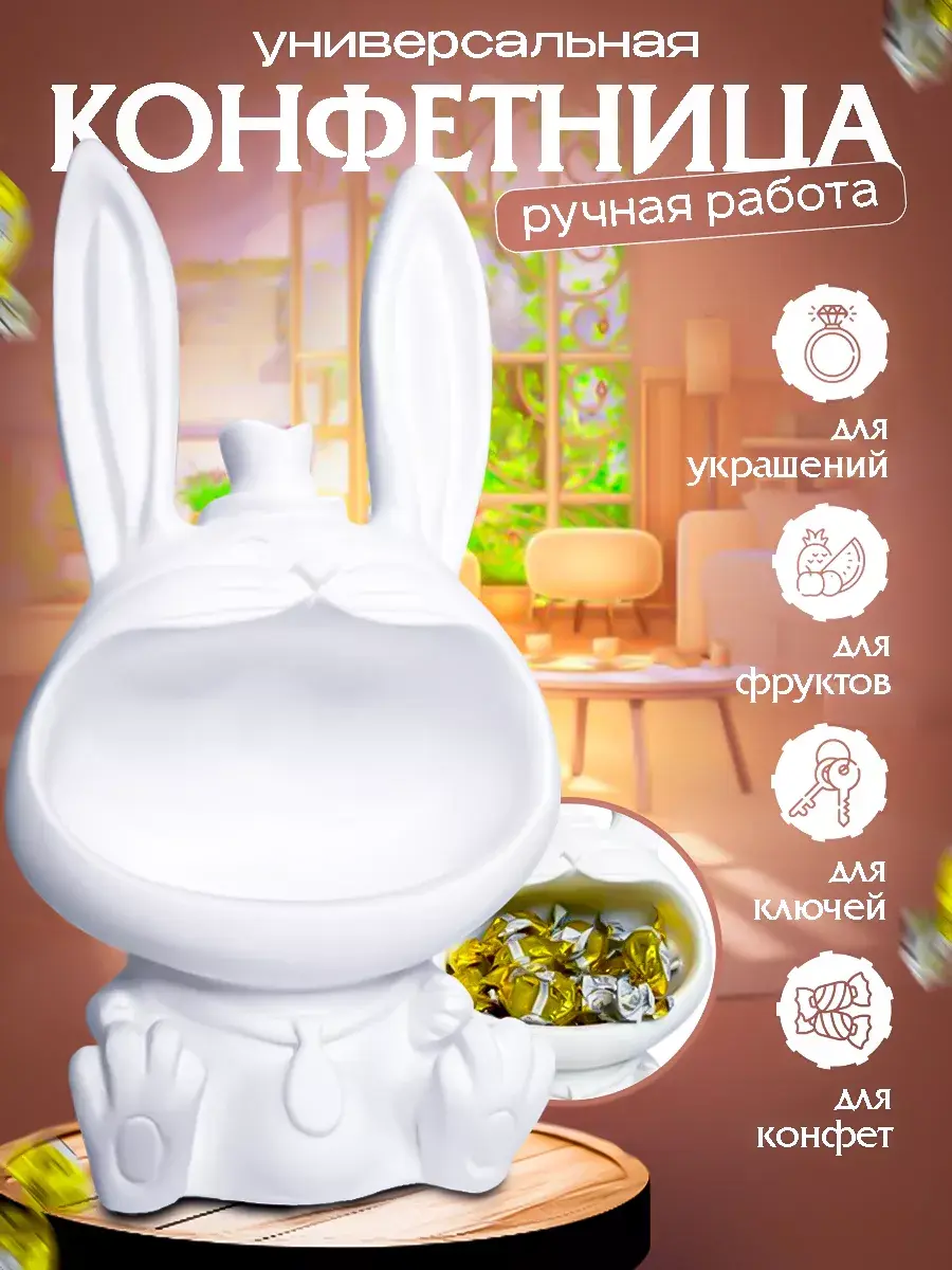 Конфетница Зайчик - легкий способ оживить сервировку и элегантно подать самые простые лакомства. Ваза для конфет пасхальный кролик имеет оригинальный дизайн, станет изюминкой Вашей кухни. Органайзер из гипса подходит для красивой сервировки конфет и фруктов, как стойка для десертов. Конфетницы также можно использовать как подставки для мелочей, ключей. Сувенирная продукция украсит сервировку вашего стола и подчеркнет прекрасный вкус хозяина, а также станет отличным подарком на все случаи жизни для женщин и мужчин, на 8 марта, 23 февраля, день рождение или новоселье у друзей, маме, папе, дочери или подарок любимому человеку, подарок учителю. Для конфет посуда идеально подходят для стильного хранения и подачи сыпучих: чая, кофе, сахара, специй. Органайзер для хранения украшений и мелочей в гостиной и прихожей, для заколок и игрушек в детской комнате. Как конфетница и подставка для фруктов в кухне. Выполнена из высококачественных материалов, в форме зайца прекрасно впишется в любой интерьер особенно в стиле ЛОФТ и современный модерн.